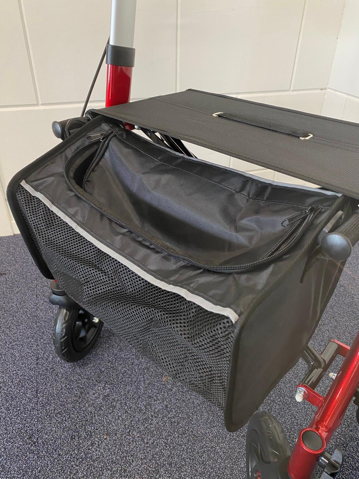 De comfortabele gevoerde zitplaats met rugleuning zorg ervoor dat je kunt rusten wanneer je dat nodig hebt. De grote opbergmand maakt het mogelijk om boodschappen of spullen met je mee te nemen. De lusremmen bieden complete controle over de snelheid en de vier 8-inch wielen zorgen voor een soepele verplaatsing op elk terrein.